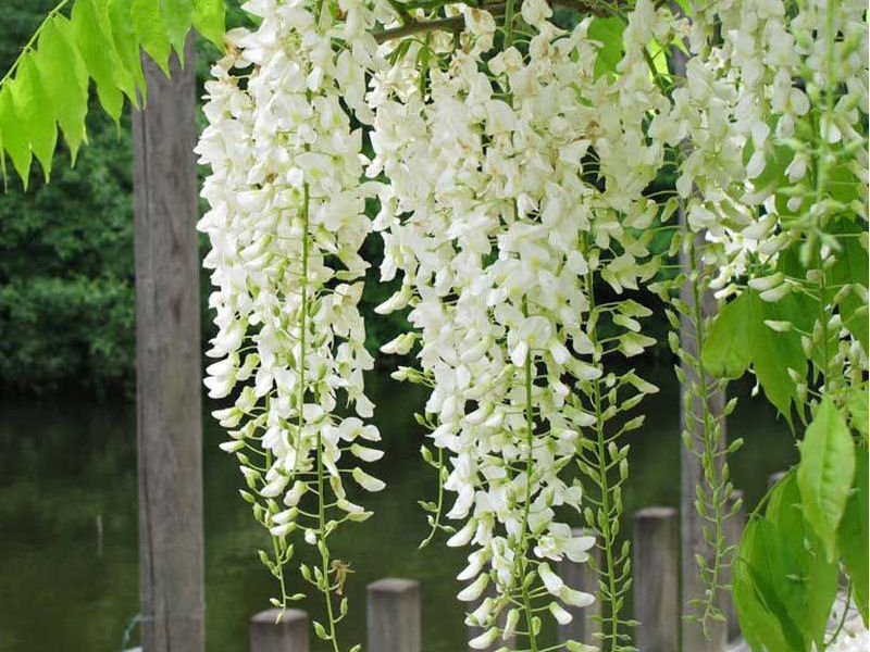 Elegancka, japońska odmiana uznawana za najładniejszą wisterię o białych kwiatach. : Białe kwiaty glicynii chińskiej spotyka się bardzo rzadko, dzięki czemu odmiana Alba jest naprawdę wyjątkowa. Kwiaty białe, w długich groniastych kwiatostanach (długości 35cm), w maju, w sierpniu pojedyncze. Liście pierzastozłożone, zielone, żółte jesienią.