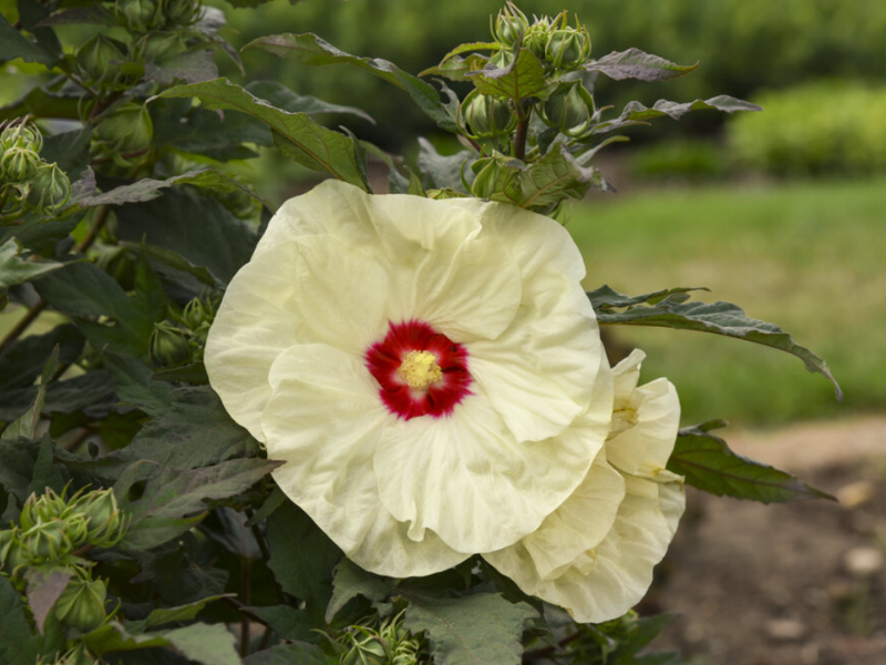 Hibiscus moscheutos "French Vanilla" ‘French Vanilla’ to odmiana z serii Summerific, znana z wyjątkowej, kremowo‑waniliowej barwy kwiatów. To jedna z najładniejszych jasnych odmian hibiskusa bagiennego – elegancka, delikatna, a jednocześnie bardzo efektowna dzięki ogromnym kwiatom i silnemu wzrostowi. Podstawowe informacje: Barwa kwiatów: kremowy- pastelowy |