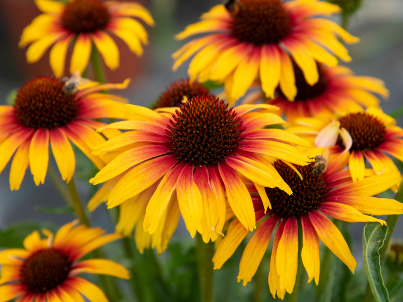 Jeżówka 'Echinacea' Parrot Jeżówka Echinacea PARROT (Echinacea PARROT) to pochodząca z Ameryki Północnej odmiana rośliny z rodziny astrowatych. Od innych bylin tej rodziny odróżnia się stosunkowo niewielką wysokością i bardzo ozdobnymi kwiatami. Kępki dorastają do 40 cm szerokości i 70 cm wysokości. Pędy pokryte są przez ciemnozielone, jajowato lancetowate, ząbkowane liście. Charakterystyczne kwiaty składają się z dużego, jeżowatego, bordowobrązowego koszyczka otoczonego przez wianuszek podłużnych żółto-bordowych płatków. Kwitnie od lipca do października, wabiąc zapachem liczne owady. Podstawowe informacje:
