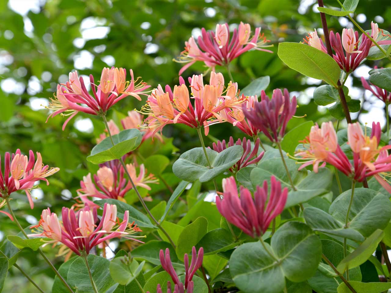 Lonicera ''Goldflame'' Długo i obficie kwitnące pnącze. Osiąga 3 m (1 m rocznie). Kwiaty rurkowate, różowoczerwone na zewnątrz i jasnożółte wewnątrz, lekko pachnące; VI-X. Owoce purpurowe; VIII-X. Zadawala się przeciętnymi…