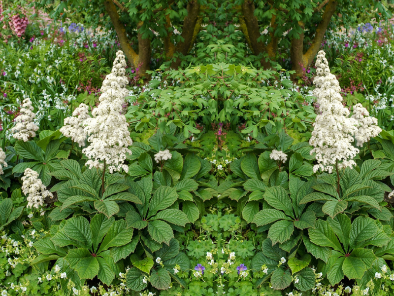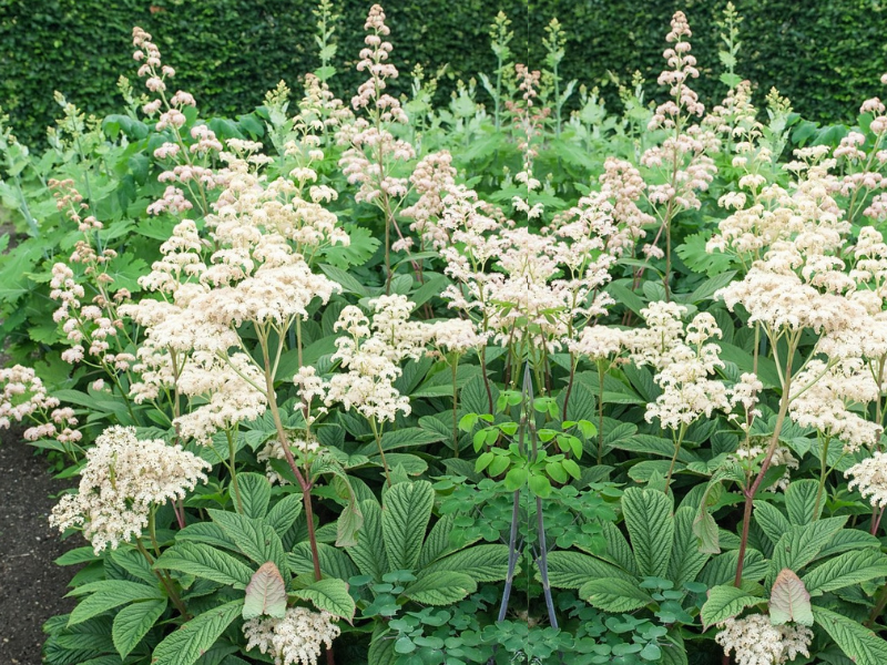 Rodgersja pierzasta 'Rodgersia' Liście byliny są błyszczące, dłoniasto złożone, osadzone na długich ogonkach. Jesienią nabierają one pięknego, czerwonego koloru. Od czerwca do sierpnia ponad kępą liści pojawiają się okazałe, stożkowate kwiatostany, które wieczorem wydzielają przyjemny zapach. Kremowo-żółte kwiaty rozwijają się stopniowo od dołu kwiatostanu ku górze. Rodgersja pierzasta stanowi przepiękną ozdobę cienistych zakątków ogrodu. Wyjątkowa bylina o dużych liściach w kolorze soczystej zieleni, które budową przypominają liście kasztanowca. Oprócz dekoracyjnego ulistnienia roślina zachwyca także okazałymi, kremowo-żółtymi kwiatostanami. Rodgersja pierzasta dorasta do około 120 cm wysokości. Podstawowe informacje: Barwa kwiatów: biała |